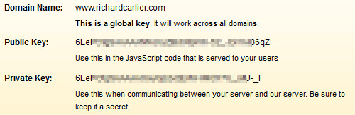 Vous obtenez alors 2 clefs, une pour la partie client (Javascript), l'autre pour la partie serveur (PHP dans notre cas). La première sera publique mais conservez l'autre secrète.