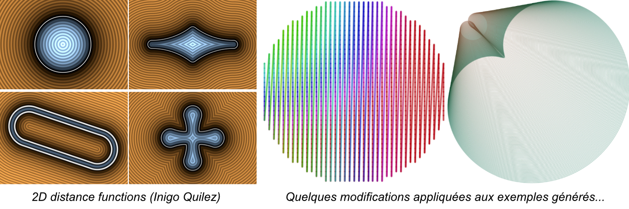 Les 4 à gauche proviennent du site d'Inigo Quilez. Les 2 de droites sont mes modifications sur le code généré, pour voir si on peut en faire quelque chose. Sans doute, mais en y passant plus de temps...