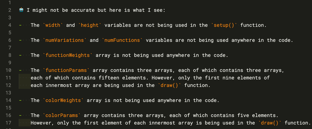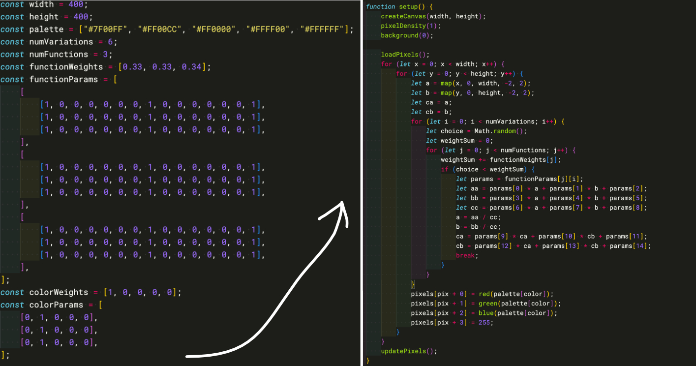 This code generates a fractal flame by randomly applying a series of variations to a point (a, b) and color until a certain number of variations have been applied. The variations are determined by randomly selecting one of the functions and applying its parameters to the point and color. The color of each pixel is determined by randomly selecting a color from the palette according to the specified weights. You can modify the parameters such as the number of variations, the functions and their weights, the palette, and the color weights to change the appearance of the fractal flame.