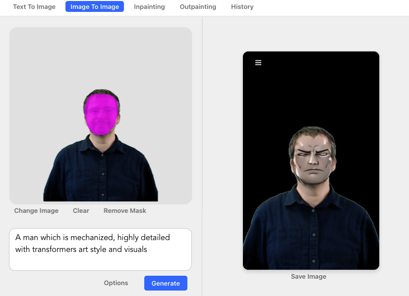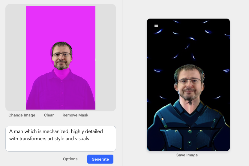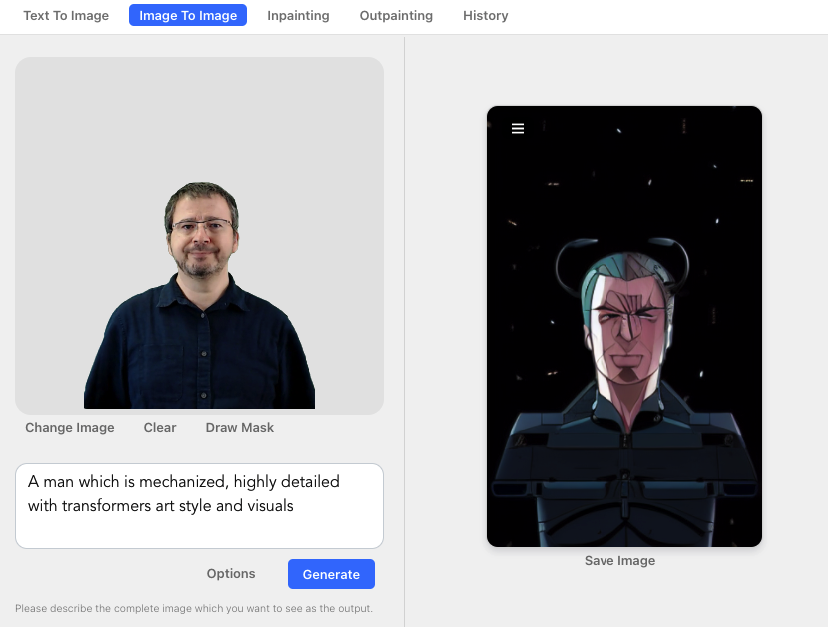 Donc, on part d'une photo de moi (à gauche, si), mon prompt devient "A man which is mechanized, highly detailed with transformers art style and visuals"