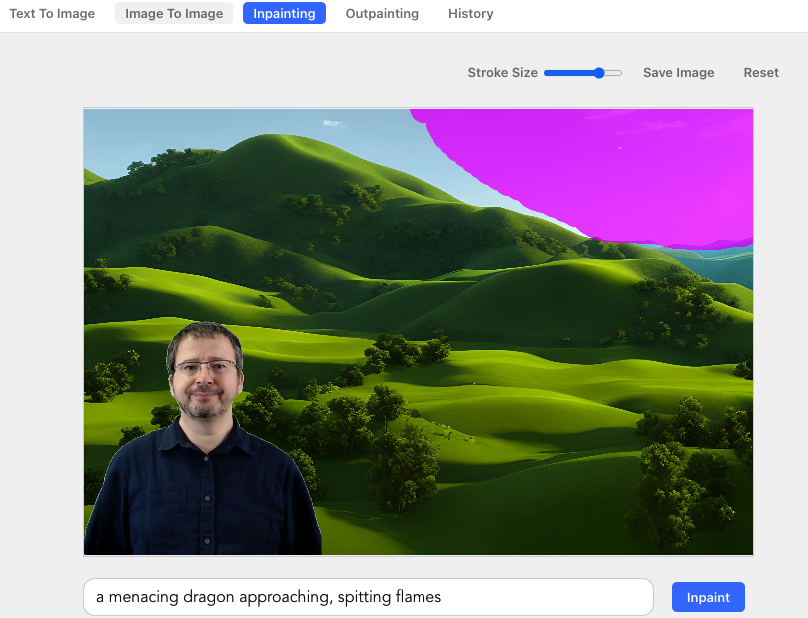 Et y ajouter un prompt, "a menacing dragon approaching, spitting flames", et un coup de pinceau violet.
