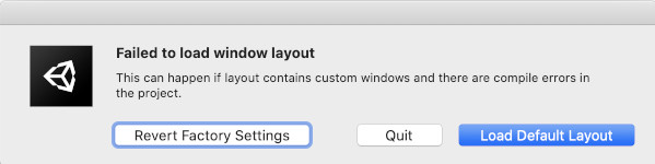 Ce genre de fenêtre est particulièrement pénible car, que l'on choisisse Revert Factory Settings ou Load Default Layout, rien n'y fait. Seul le bouton Quit marche, mais évidement le projet ne se charge pas.