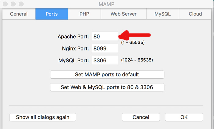 Pour Mamp, j'ai l'habitude donc de le caler sur le port 80, norme standard. Pour ce faire, allez dans le menu MAMP, puis Préférences, puis Ports, et précisez les valeurs ci dessous: